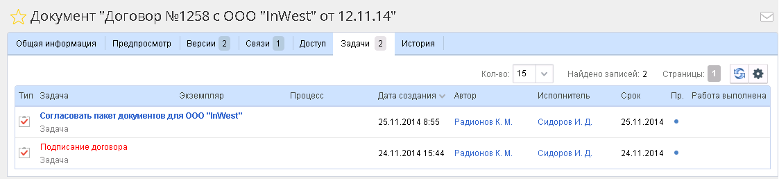 На данной вкладке в таблице отображаются все задачи, в которые вложен текущий документ. Данная таблица может быть настроена.