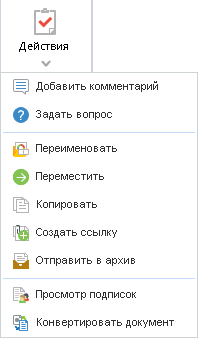 При нажатии на кнопку Действия или на пиктограмму появляется выпадающее меню, которое предлагает выбрать следующие действия: