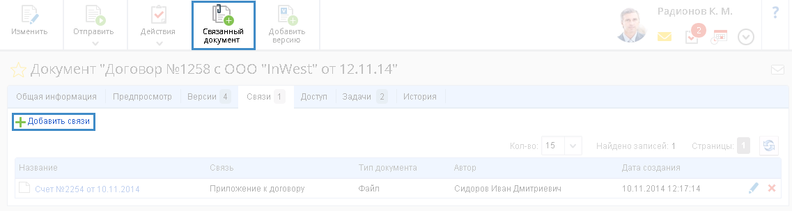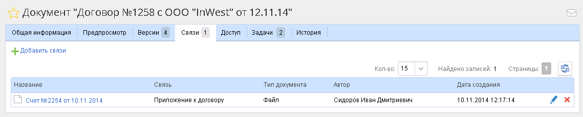 Следует отметить, что при создании связи между документами, данная связь будет отображена в карточке каждого из них.