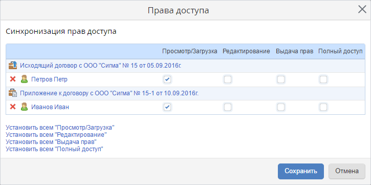 После добавления требуемых прав доступа к документам необходимо нажать на кнопку Сохранить.