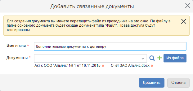 Копировать права доступа – возможность автоматического наследования документом прав доступа того документа, в котором создается связь.