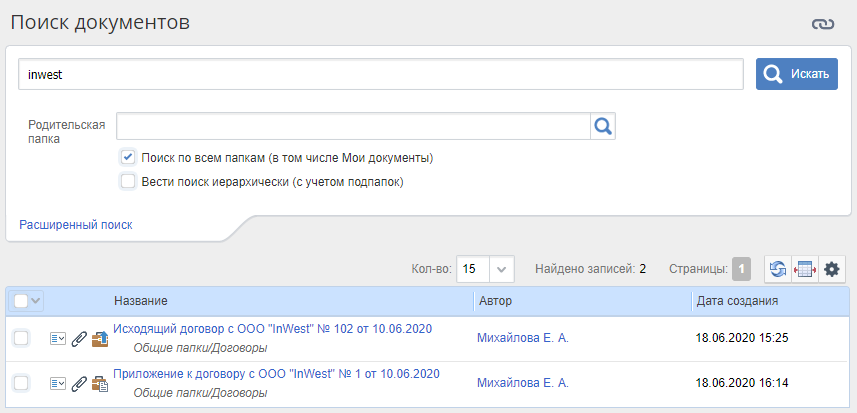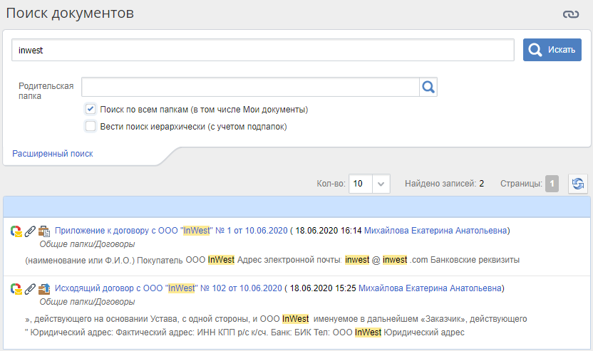 Поиск по всем папкам (в том числе Мои документы) – поиск документов по всему хранилищу документов, в том числе и во вложенных папках. Данный флажок установлен по умолчанию. При выборе родительской папки флажок снимается автоматически.