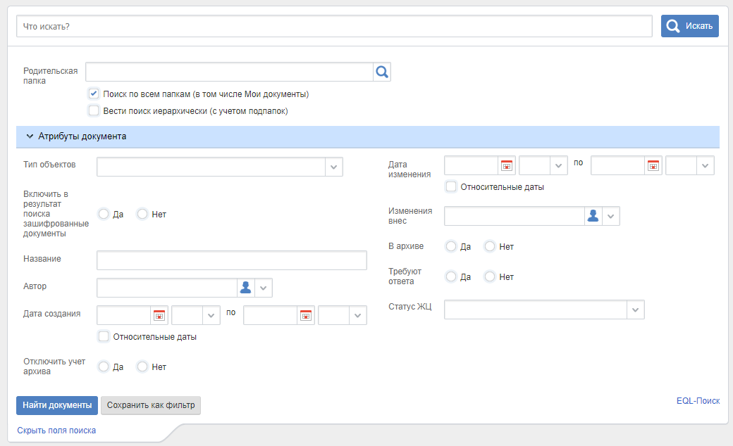 Вести поиск иерархически (с учетом подпапок) – поиск документов в выбранной родительской папке, в том числе в ее вложенных папках.