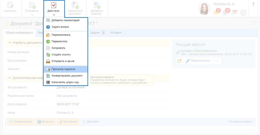 Рис. 1. Карточка документа. Кнопка "Действия – Просмотр подписок"