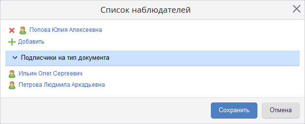 В том случае, если пользователь подписан на оповещения об изменениях документов определенного типа, тогда у данного пользователя в карточке документа данного типа в правом верхнем углу вместо значка будет отображаться значок . Информация о подписавшемся пользователе будет отображаться в Списке наблюдателей документа на панели Подписчики на тип документа (рис. 2).