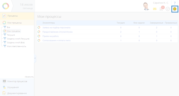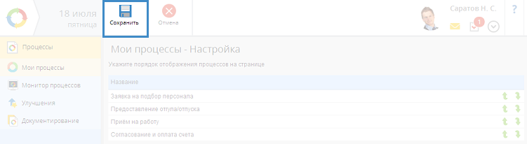 На странице Мои процессы отображаются (и поддаются настройке, соответственно) только те процессы, для которых существует хотя бы один экземпляр с участием пользователя. Когда для какого-либо процесса впервые запускается экземпляр, этот процесс добавляется в конец списка на странице.