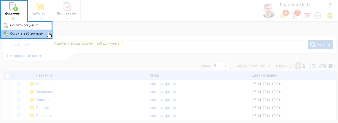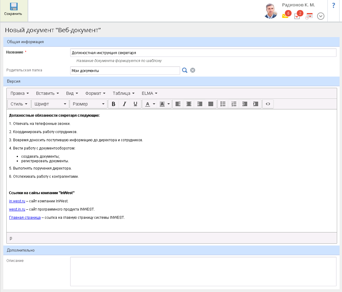 Веб-документ в системе ELMA может быть создан несколькими способами. Для этого необходимо: