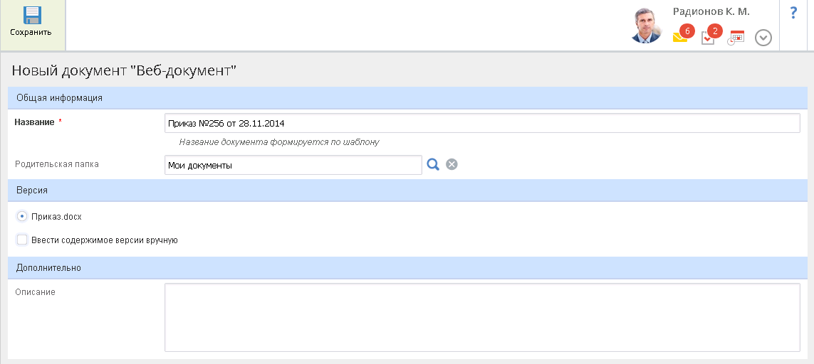 Следует отметить, что если в веб-приложении в настройках типа документа для данного типа документа задан шаблон, то разделе Версия на форме создания веб-документа будет отображен флажок Ввести содержимое версии вручную. При снятии данного флажка пользователю будет доступен выбор шаблона. При наличии в системе ELMA шаблонов для данного типа документов, по умолчанию при создании веб-документа будет открыта страница следующего вида (рис. 4):