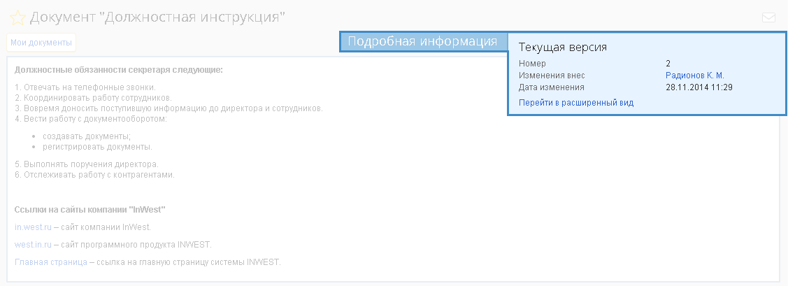 Для перехода к расширенному отображению карточки необходимо нажать на кнопку Перейти в расширенный вид. В данном случае отображение карточки веб-документа будет аналогично отображению карточки обычного документа (рис. 3).