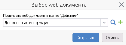 Для прикрепления веб-документа к папке необходимо в верхнем меню требуемой папки нажать на кнопку Действия – Привязать веб-документ. В открывшемся диалоговом окне (рис. 2) необходимо выбрать веб-документ, который следует привязать к папке и нажать на кнопку Сохранить.