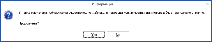 1. Выгрузить файлы для перевода конфигурации. В качестве папки назначения следует выбрать папку …\<Общая папка с файлами системы ELMA>\Web\Resources\<название языка, на который осуществлялся перевод>, в которой хранятся ранее переведенные и уже используемые файлы конфигурации. Например, для перевода конфигурации на английский язык необходимо поместить полученные файлы в папку …\<Общая папка с файлами системы ELMA>\Web\Resources\en-US. При этом после выбора файлов локализации будет отображено предупреждение о слиянии существующих файлов конфигурации с выгружаемыми файлами (рис. 2).