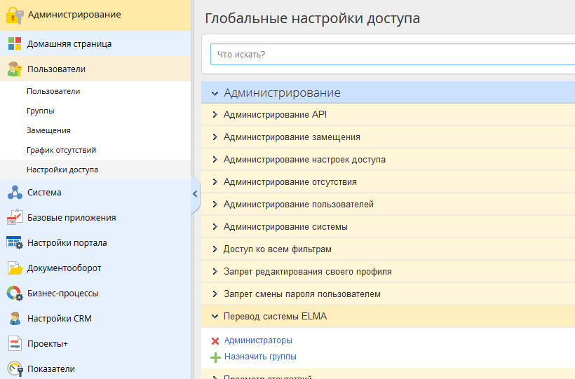 Рис. 1. Назначение прав доступа к функции "Перевод системы ELMA"