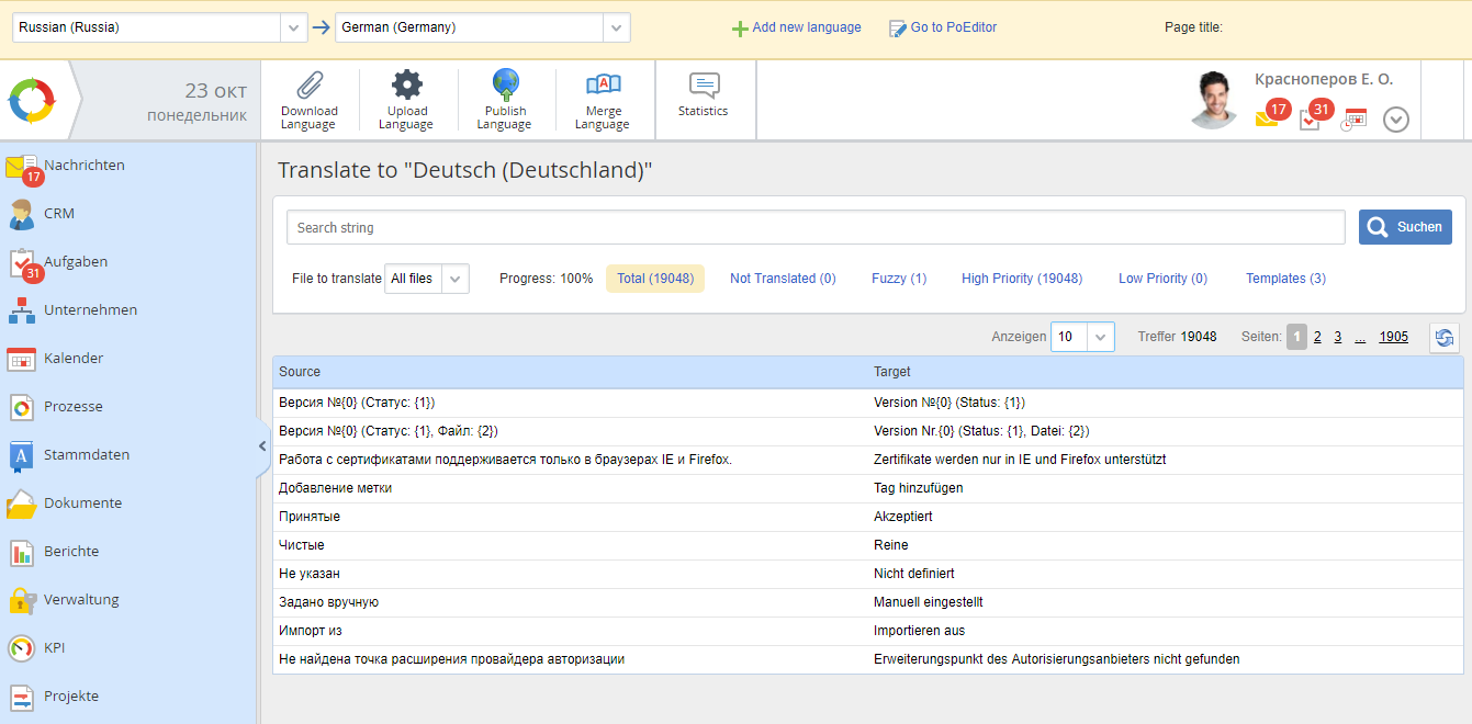 Помимо перевода отдельных элементов страниц системы ELMA доступна возможность перевода всех лексических единиц системы ELMA. Перевод, а также просмотр/фильтрация лексических единиц осуществляются в разделе PoEditor (рис. 9).