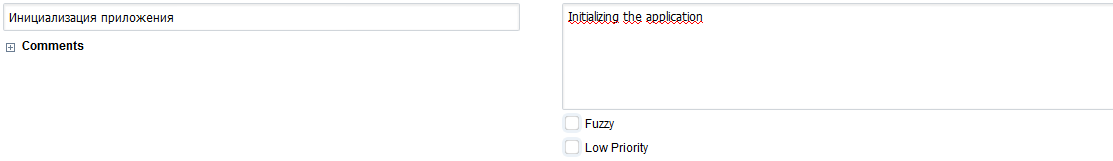 Ниже перевода лексической единицы отображаются флажки Fuzzy и Low Priority, позволяющие установить соответствующие признаки фильтрации для текущей лексической единицы.
