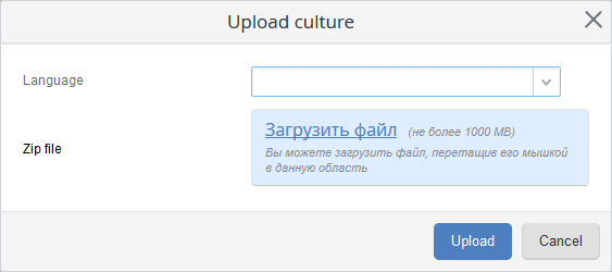 Загрузка файла (проекта) с настройками языка. Данная возможность предназначена для переноса шаблонов перевода с одной конфигурации на другую (например, с тестовой на боевую). При нажатии на данную кнопку открывается диалоговое окно (рис. 13), в котором необходимо из выпадающего списка выбрать требуемый язык и прикрепить архив с настройками языка, после чего нажать на кнопку Download.