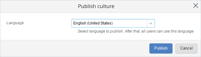Публикация нового языкового проекта. При нажатии на данную кнопку открывается диалоговое окно (рис. 14), в котором необходимо из выпадающего списка выбрать язык, который необходимо опубликовать, и нажать на кнопку Publish.