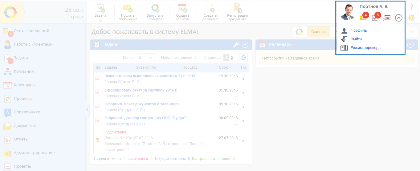 У пользователя, обладающего правами на перевод системы ELMA, в меню пользователя отображается кнопка Режим перевода (рис. 2).