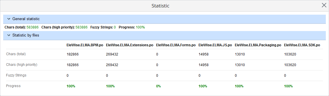 Статистика по переведенным языковым файлам. При нажатии на данную кнопку открывается диалоговое окно (рис. 15) с общей статистикой и статистикой по файлам.
