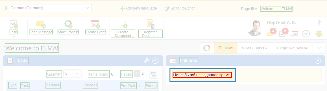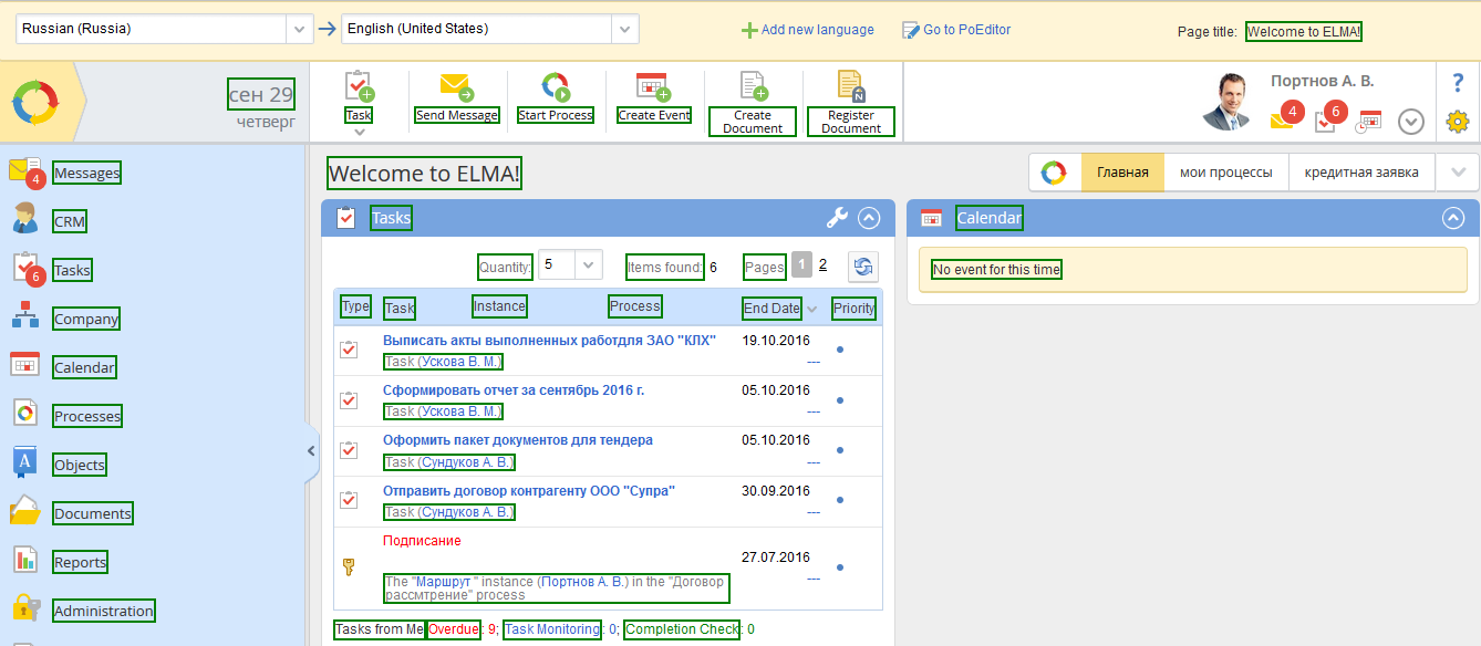 По умолчанию элементы страниц системы ELMA могут быть переведены на английский, немецкий и испанский языки. При выборе данных языков элементы страниц будут переведены автоматически.