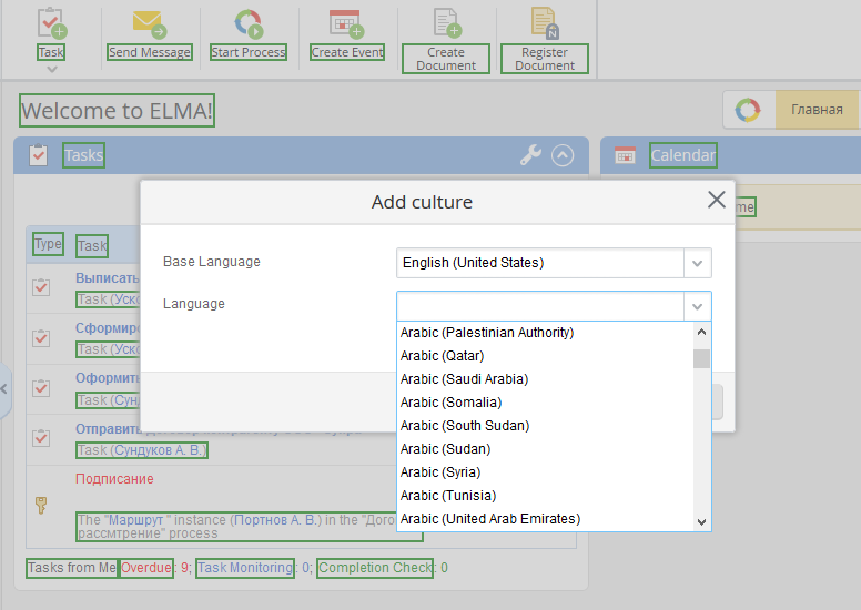 Во всех редакциях (Community Edition, Express, Standard, Enterprise) системы ELMA реализована возможность перевода интерфейса системы на иностранный язык из списка доступных языков (английский, немецкий, испанский), а также ручного перевода на любой доступный язык.