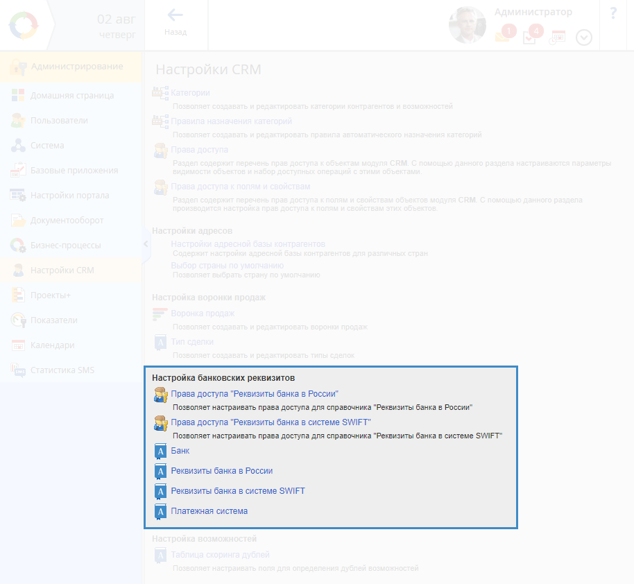 Первоначальная настройка возможности работы с банковскими реквизитами осуществляется в разделе Администрирование – Настройки CRM в блоке Настройка банковских реквизитов (рис.1).