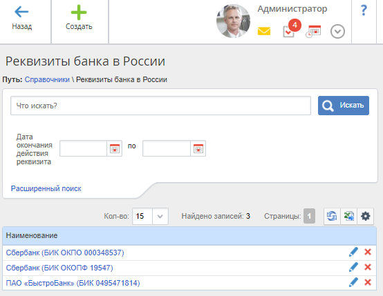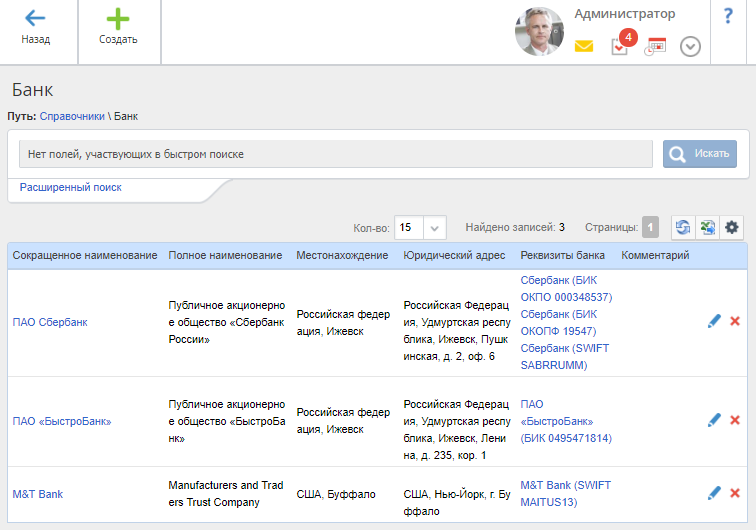 В данном справочнике (рис. 2) отображается полная информация о банках, с которыми могут сотрудничать контрагенты. Записи данного справочника используются при работе с контрагентами, а также в расширенном поиске в разделе Контрагенты в строке Банковские счета .