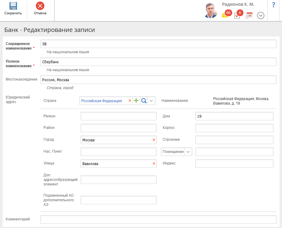 Рис. 5. Создание записи справочника "Реквизиты банка в России"