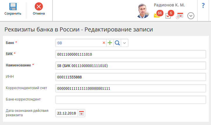 На данной форме необходимо выбрать банк (из справочника Банк), реквизиты которого требуется указать, а также ввести его БИК, ИНН, корреспондентский счет, информацию о банке-корреспонденте и дату окончания действия реквизита. Поле Наименование * при этом заполняется автоматически (формируется из сокращенного наименования банка и его БИК).