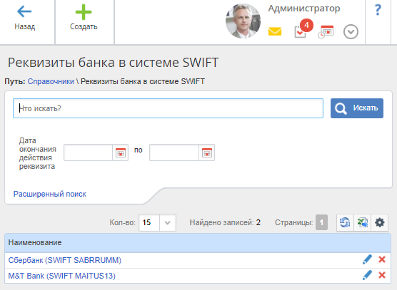 Рис. 6. Справочник " Реквизиты банка в системе SWIFT"