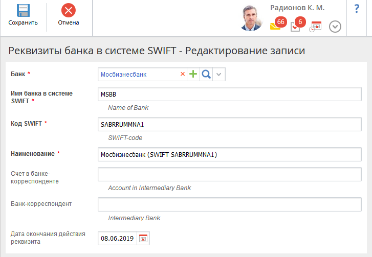 На данной форме необходимо выбрать банк (из справочника Банк), после чего требуется ввести имя банка в системе SWIFT, код SWIFT, а также информацию о счете в банке-корреспонденте, о самом банке-корреспонденте и дату окончания действия реквизита. Поле Наименование * при этом заполняется автоматически (формируется из сокращенного наименования банка и кода SWIFT).