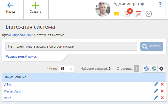 Данный справочник (рис. 8) предназначен для хранения списка платежных систем, используемых контрагентами. Записи данного справочника могут быть использованы только при работе с Физическими лицами (недоступны при работе с Юридическими лицами). Для Физических лиц записи данного справочника используются при заполнении данных о платежных картах/кошельках (вкладка Реквизиты карточки контрагента, панель Платежные карты (кошельки).