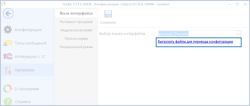 Для того, чтобы выгрузить файлы для перевода конфигурации, необходимо в главном меню Дизайнера ELMA в разделе Настройки нажать на ссылку Выгрузить файлы для перевода конфигурации, расположеннуюниже поля Выбор языка интерфейса (рис. 1).