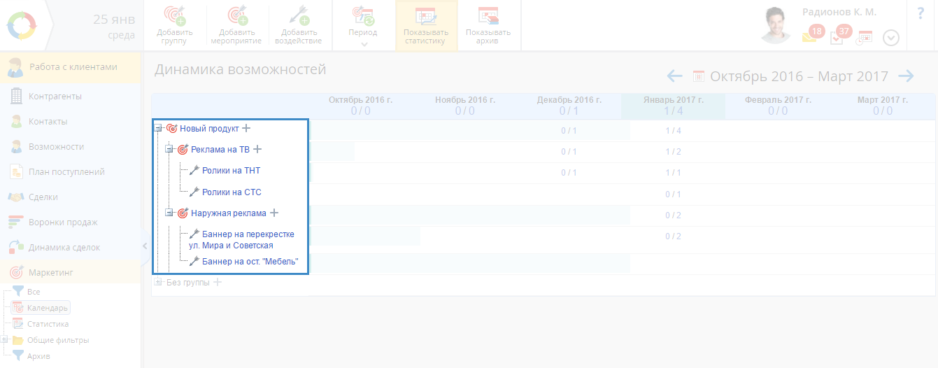 На рис. 1 приведен пример группы маркетинговых мероприятий "Новый продукт" с маркетинговыми мероприятиями "Реклама на ТВ", "Наружная реклама", содержащими различные маркетинговые воздействия ("Баннер на ост "Мебель", "Ролик на ТНТ", "Ролики на СТС" и др.).