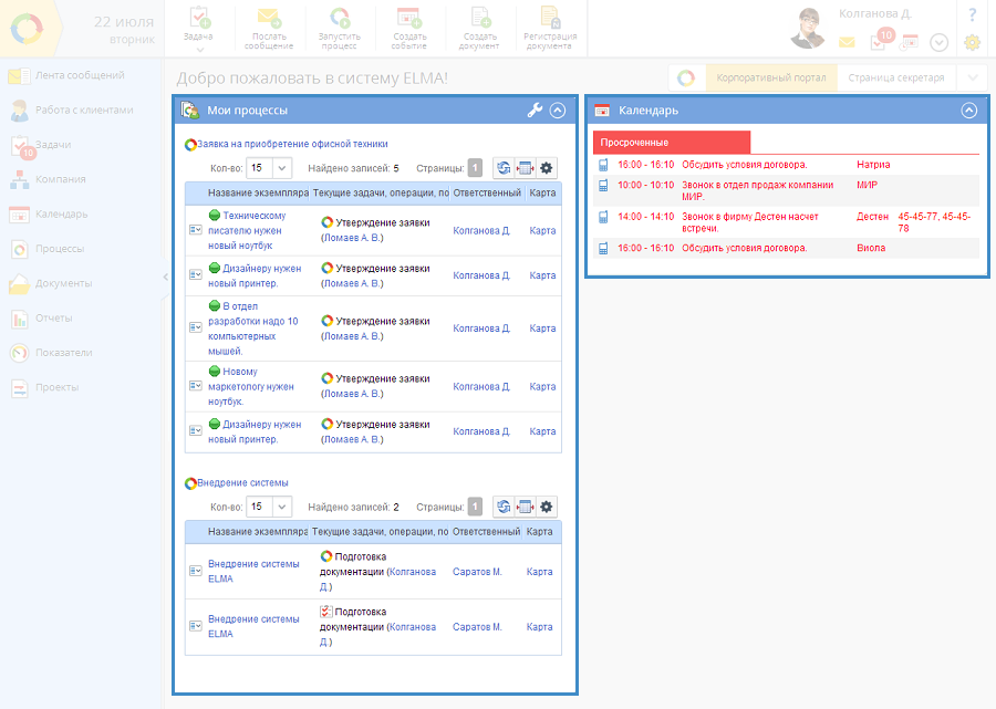 Рис. 1. Главная страница системы ELMA. Портлеты "Мои процессы" и "Календарь"