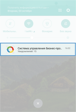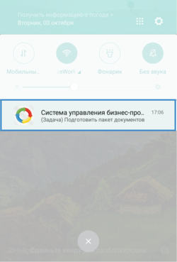 На платформе Android PUSH-уведомления отображаются в меню быстрого доступа к настройкам мобильного устройства даже во время работы в нём. В левой части экрана на верхней панели инструментов появляется значок , сообщающий пользователю о новом сообщении или задаче.