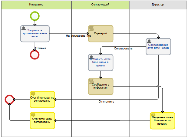 Для расширения лимита трудозатрат рекомендуется использовать возможность создания процесса по проекту. Графическая модель процесса по расширению лимита трудозатрат может выглядеть следующим образом (рис. 1):