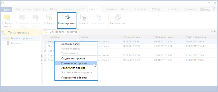 щелкнув правой кнопкой мыши по названию типа проекта в списке типов проектов и выбрав из контекстного меню пункт Изменить тип проекта (рис. 1).