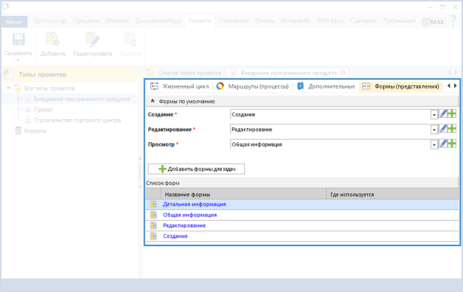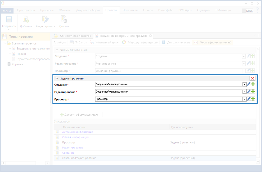 Рис. 8. Карточка типа проекта. Вкладка "Формы (представления)"