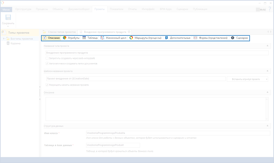 Карточка типа проекта содержит следующие вкладки (рис. 2):