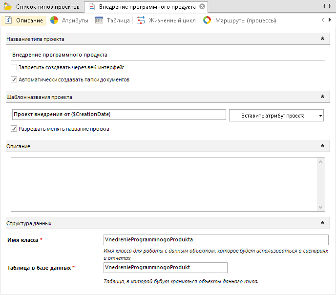 Рис. 3. Карточка типа проекта. Вкладка "Описание"