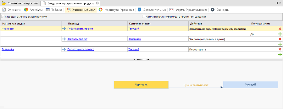 Данная вкладка частично аналогична вкладке Жизненный цикл , расположенной в карточке типа документа. Различие заключается во флажках Разрешить менять стадии вручную и Автоматически публиковать проект при создании, а также в наличии дополнительных столбцов Действие и По умолчанию (рис. 4).