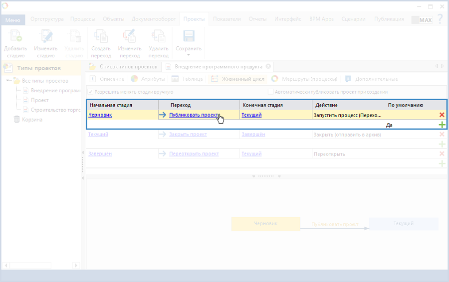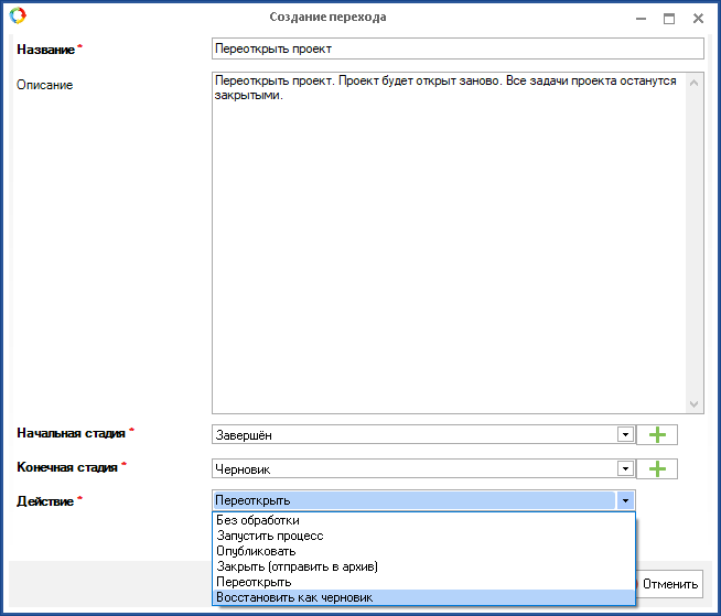 статус "Черновик". Следует отметить, что данное действие выбирается только в случае создания перехода, начальная стадия которого "Завершен", а конечная "Черновик", в противном случае смена статуса проекта не будет осуществлена.