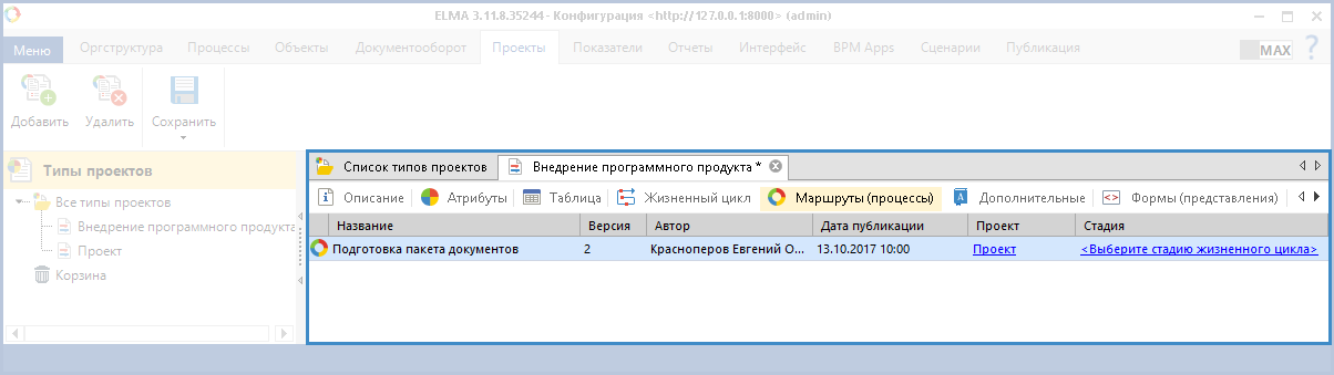 Рис. 4. Карточка типа проекта. Вкладка "Жизненный цикл"