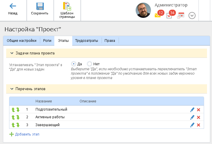 Рис. 1. Страница настройки типа проекта. Вкладка "Этапы"