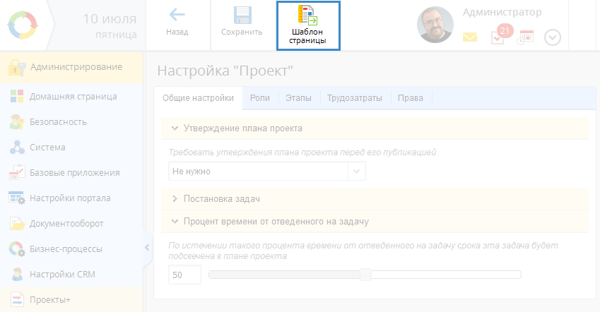 Будет открыта страница настройки шаблона страницы выбранного типа проекта (рис. 2). Внешний вид данной страницы и принципы работы с ней аналогичны внешнему виду и принципам работы со страницей проекта.
