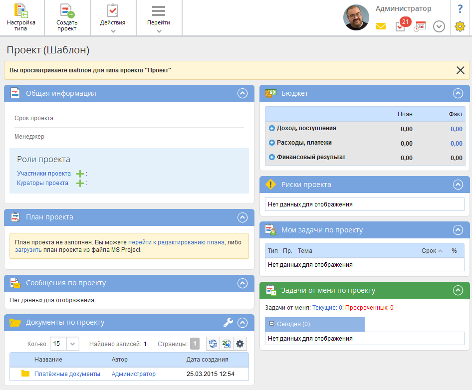 На странице шаблона проекта могут быть заполнены некоторые проектные портлеты. Информация, указанная в шаблоне, будет присутствовать во всех проектах данного типа. Кроме того, могут быть добавлены дополнительные портлеты, которые будут отображаться во всех проектах данного типа.