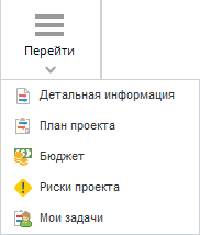 При нажатии на кнопку Перейти и/или пиктограмму открывается выпадающее меню, которое предлагает просмотреть детальную информацию о проекте данного типа, а также перейти на страницу настройки шаблонов: