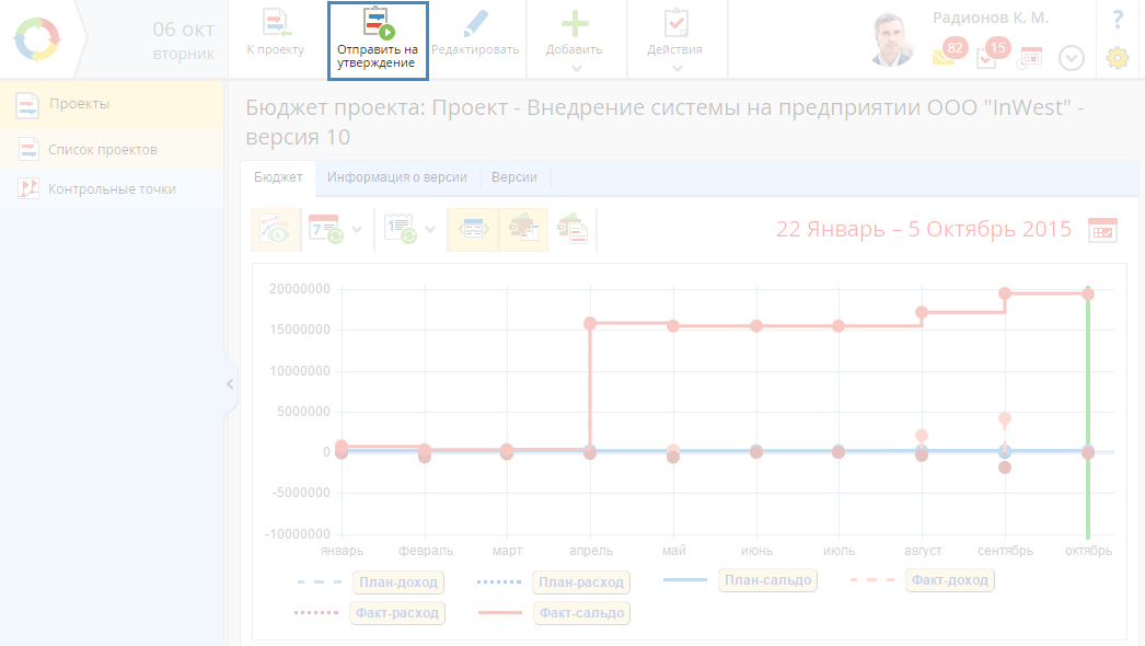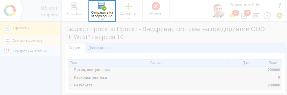 Отправка бюджета проекта на утверждение