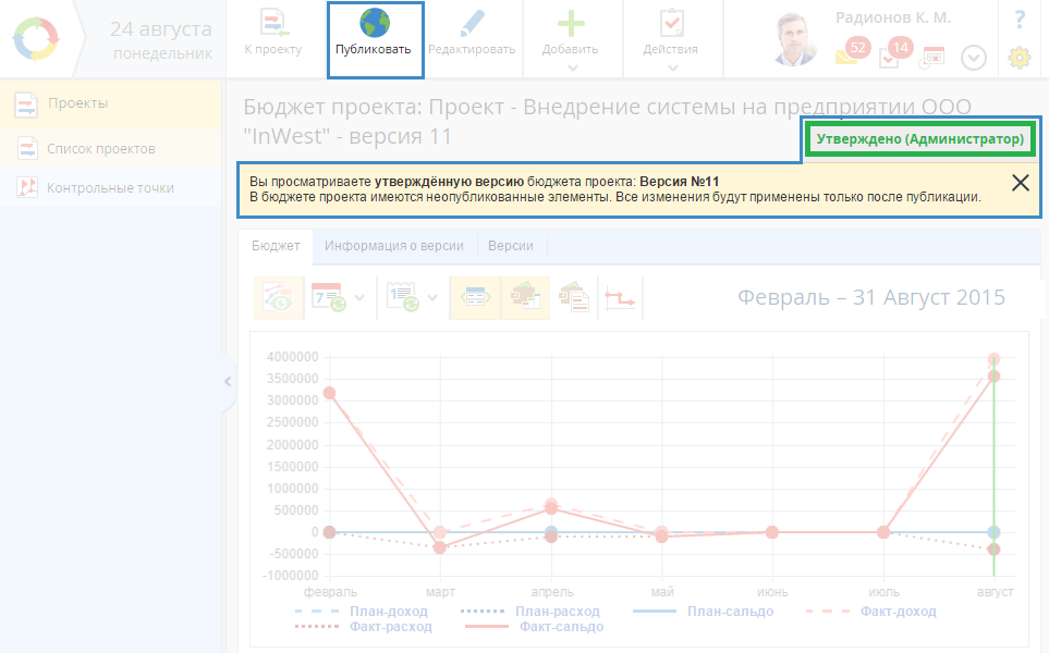 В том случае, если при отправке бюджета проекта на утверждение (рис. 3), не был установлен флажок Опубликовать после утверждения, топосле утверждения бюджета проекта на его странице (рис. 5) будет отображена соответствующая отметка, а также доступна кнопка Публиковать.