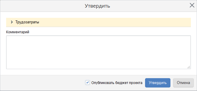 Данная возможность доступна только при выполнении соответствующих настроек в требуемом типе проекта. Данная настройка осуществляется в разделе Администрирование – Проекты+ – Типы проектовна странице настройки требуемого типа проекта на вкладке Общие настройкив блоке Утверждение бюджета проекта. Подробнее о выполнении данной настройки см. соответствующий раздел справки.